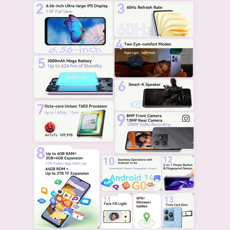 1. CPU: Unisoc SC9863A T603, octa-core, 8 x 1.6 GHz Arm Cortex-A55