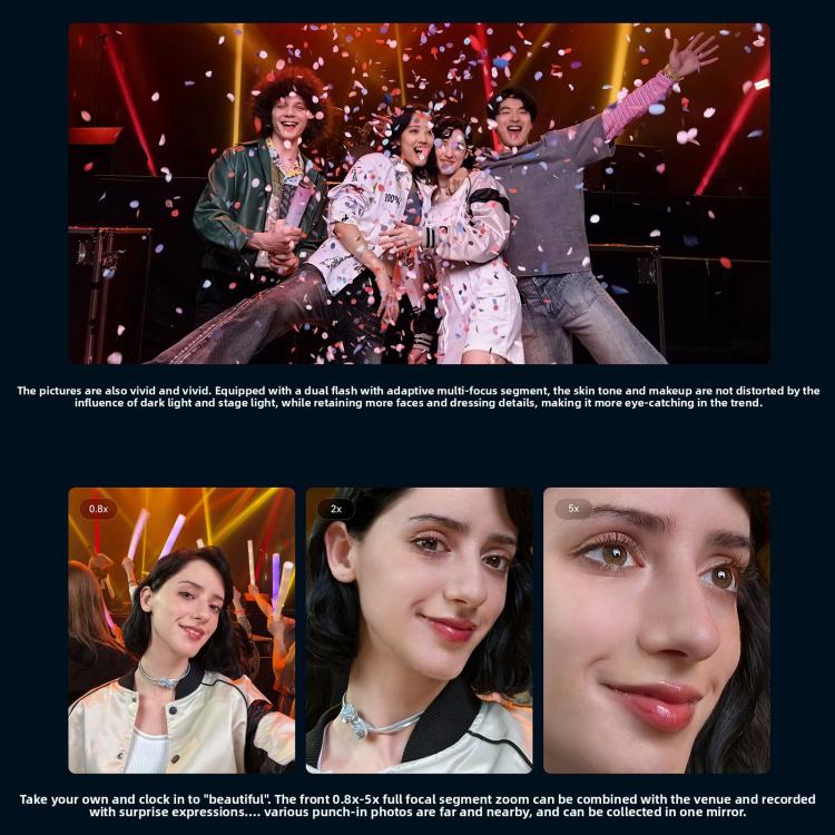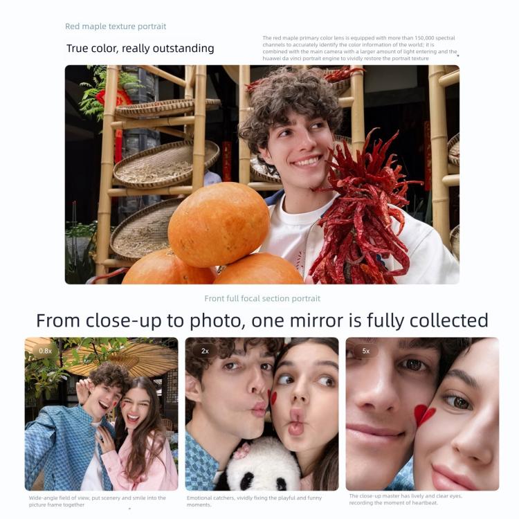 2. Front Camera: 50MP ultra-clear portrait tracking lens (F2.0) + 8MP 5x zoom portrait close-up lens (F2.2)