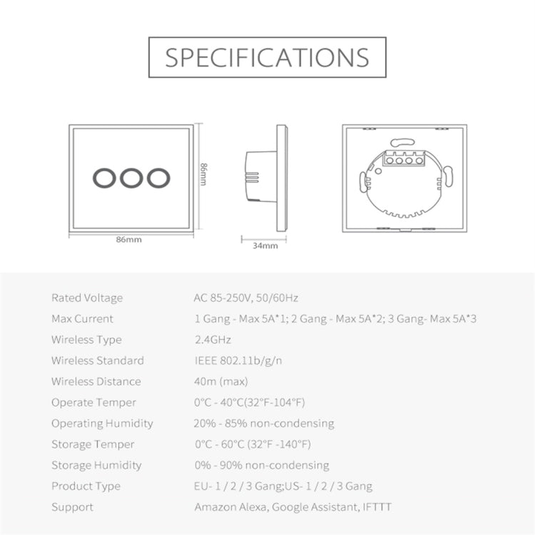 4.Wifi distance:45m 5.Free app:Tuyasmart or Smart Life.