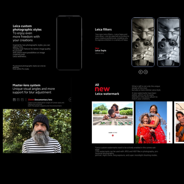 2. Rear camera photography features: Two Leica photographic styles, Leica Authentic Look, Leica Vibrant Look, Leica custom photographic styles, Leica filters, Leica classic shutter sound, Leica Watermark, Master-lens system, 35mm Documentary lens, 50mm Swirly bokeh lens, 90mm Soft focus lens